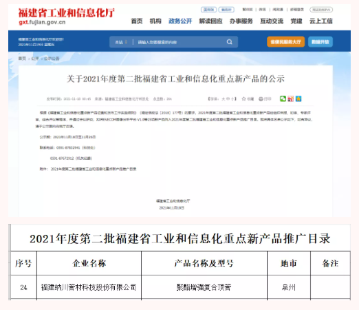 日前,福建省工業和信息化廳發布了《關于2021年度第二批福建省工業和信息化重點新產品的公示》,納川股份“聚酯增強復合頂管”列入2021年度福建省工業和信息化重點新產品推廣目錄。